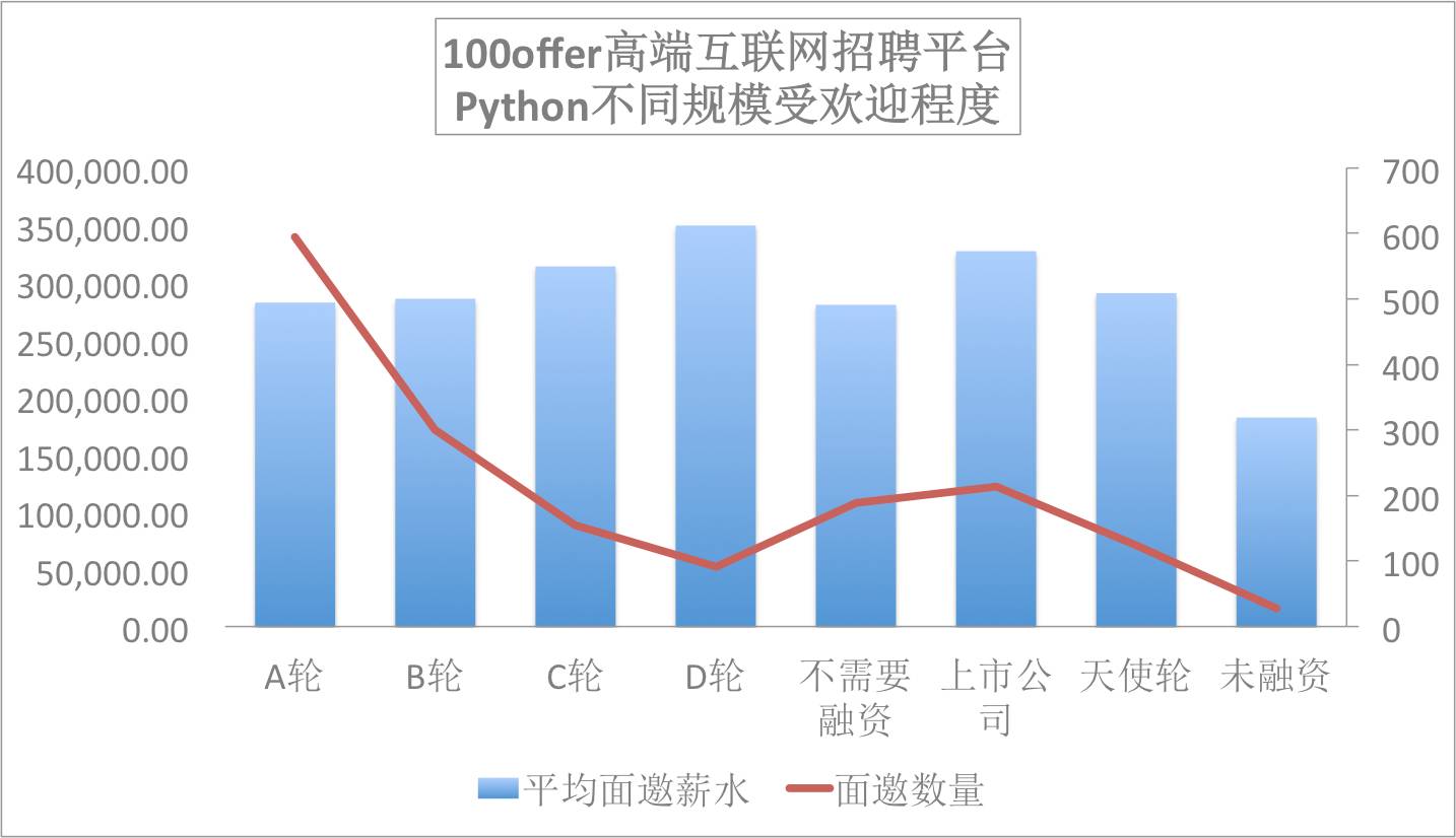 无论是人均面邀数还是平均面邀年薪,Python工程师都排在较高的位置上。对于不同规模的企业来说,除了未融资和不需要融资的企业,Python程序员的薪资呈企业规模越大薪资越高的趋势(上市公司开出的平均年薪比D轮略低。)