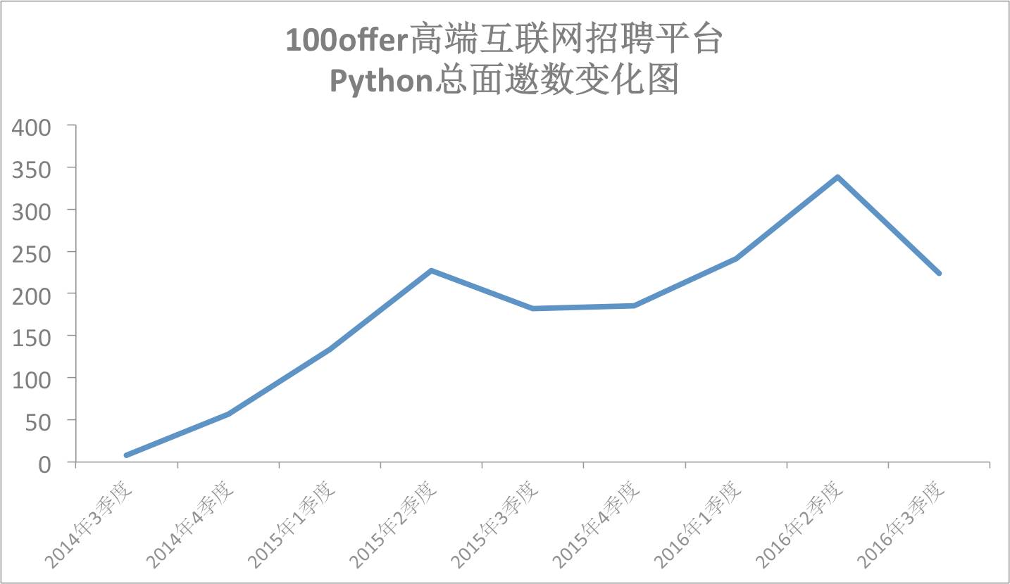 此次我们统计了九个季度(2014年7月至2016年9月)以来企业对Python开出的总面邀数。